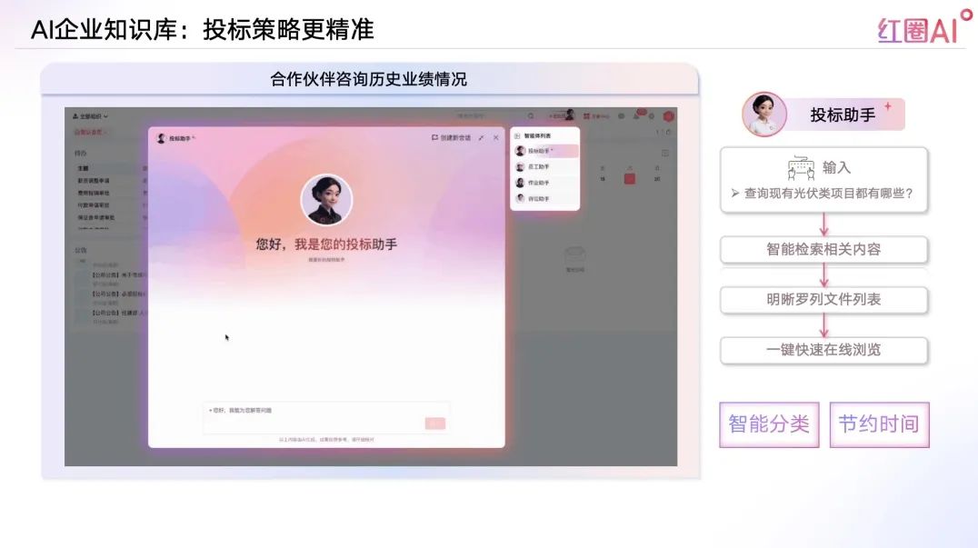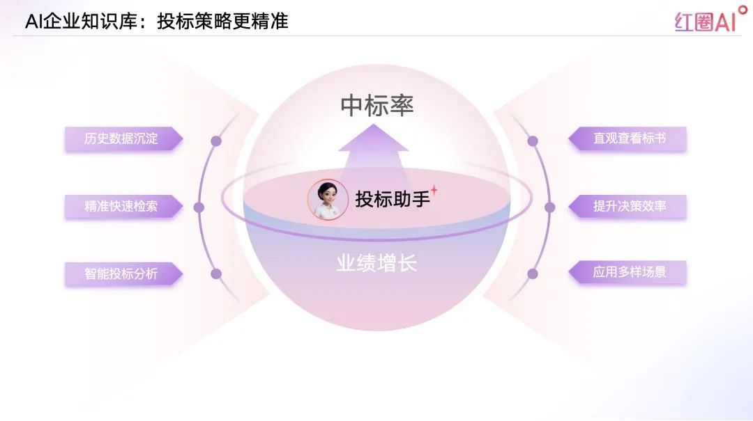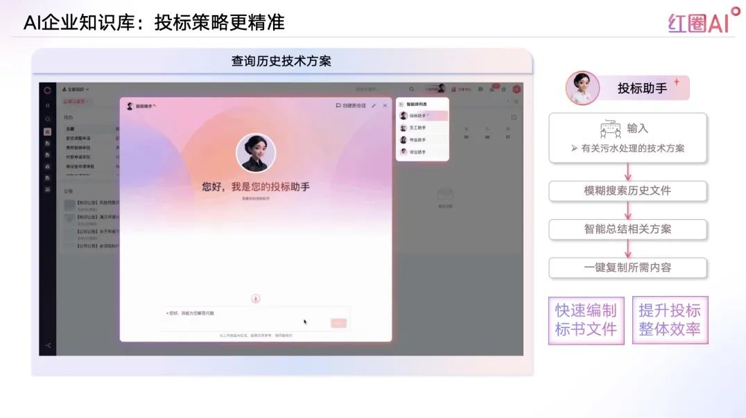 以往投標(biāo)流程中,資料查找和內(nèi)容比對耗時(shí)耗力、風(fēng)險(xiǎn)頻發(fā)。紅圈AI通過快速檢索歷史標(biāo)書、技術(shù)方案、成功案例等內(nèi)容,助力企業(yè)建立專屬“投標(biāo)智庫”,讓策略制定更具數(shù)據(jù)支撐。