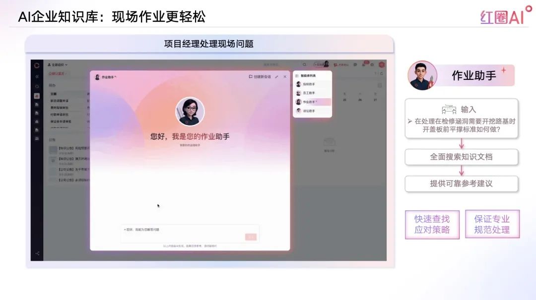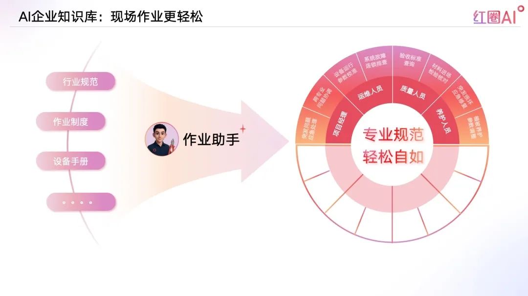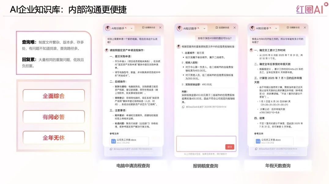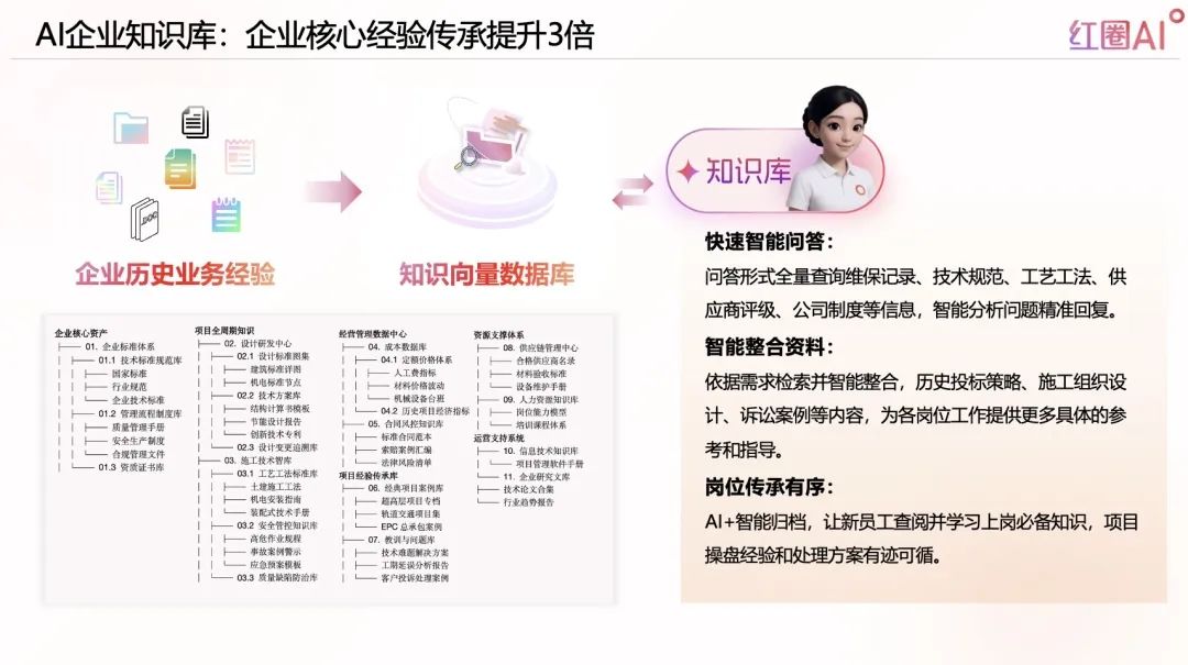 紅圈AI,以大模型+智能檢索技術(shù)為引擎,構(gòu)建企業(yè)知識資產(chǎn)體系,實(shí)現(xiàn)“經(jīng)驗(yàn)即問即答”,推動(dòng)企業(yè)從“人找知識”走向“知識找人”。