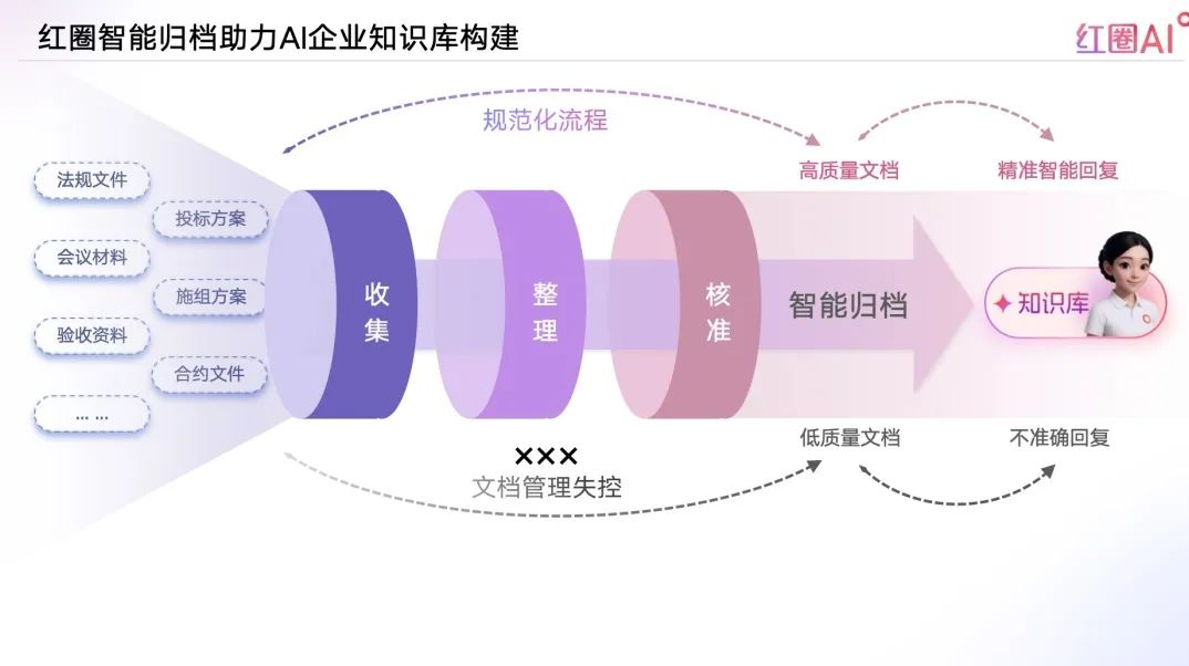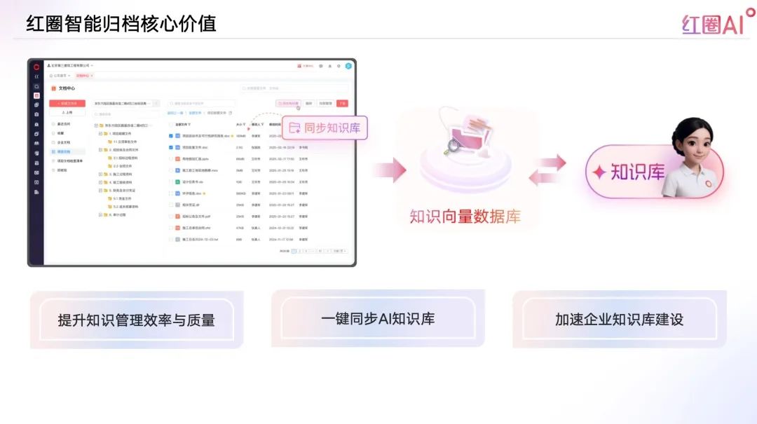 通過精準(zhǔn)分類、統(tǒng)一歸集、秒級同步,紅圈AI幫助企業(yè)在最短時(shí)間、最低成本內(nèi)構(gòu)建企業(yè)級知識體系,實(shí)現(xiàn)知識管理智能化、資產(chǎn)化、標(biāo)準(zhǔn)化。
