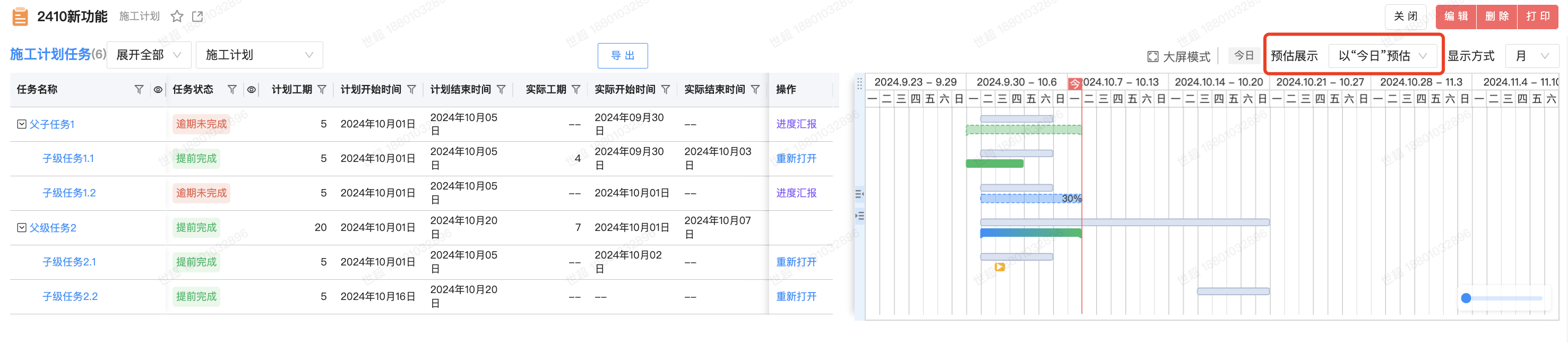 ● 支持以“今日”預估 任務進展的橫道圖展示
