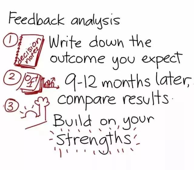 要發(fā)現(xiàn)自己的長處,唯一途徑就是回饋分析法(feedback analysis)。每當(dāng)做出重要決定或采取重要行動(dòng)時(shí),你都可以事先記錄下自己對結(jié)果的預(yù)期。9 到 12 個(gè)月后,再將實(shí)際結(jié)果與自己的預(yù)期比較。