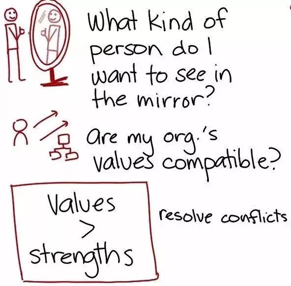 一個(gè)人的工作方式和他的長處很少發(fā)生沖突,相反,兩者能產(chǎn)生互補(bǔ)。但是,一個(gè)人的價(jià)值觀有時(shí)會(huì)與他的長處發(fā)生沖突。