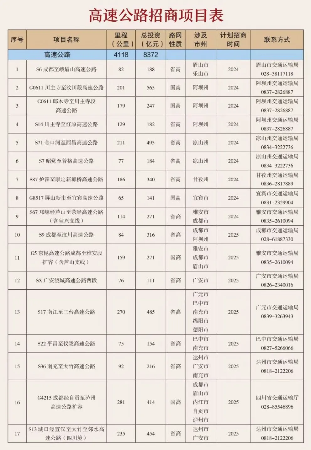 此次座談會重點集中推介36個高速公路項目(總里程約4100公里、總投資約8400億元),遍布四川省20個市(州)。其中: