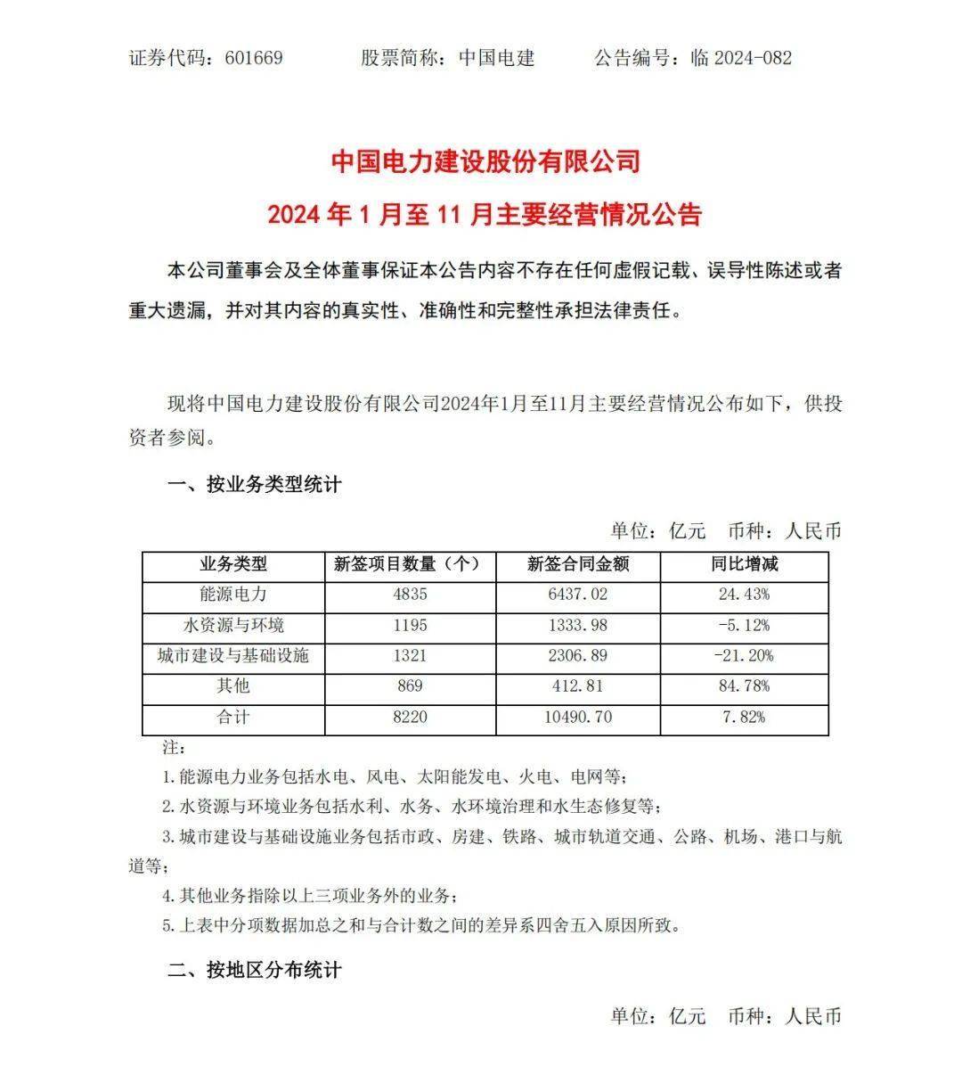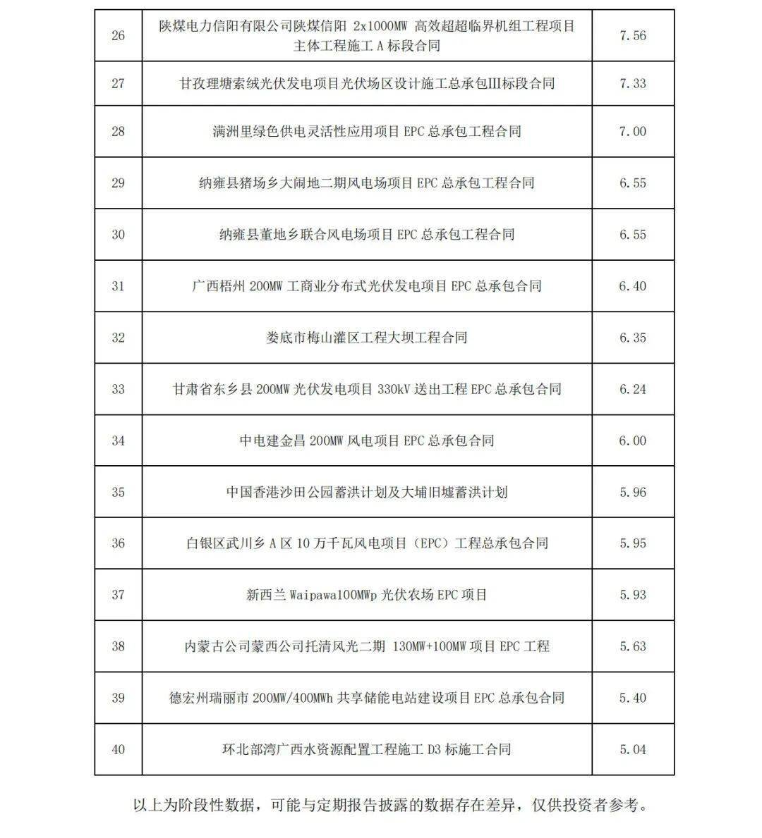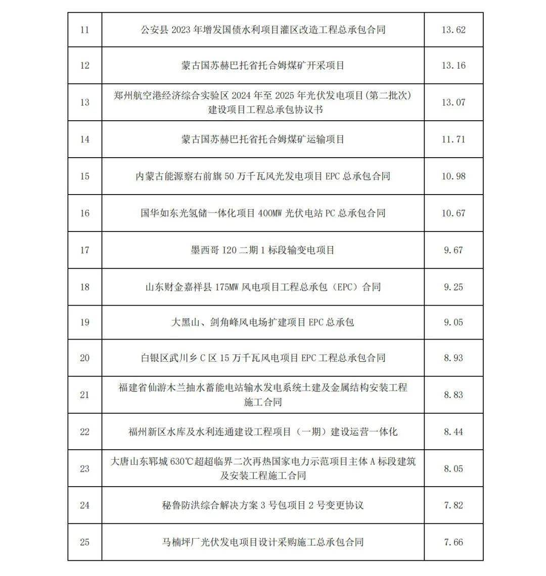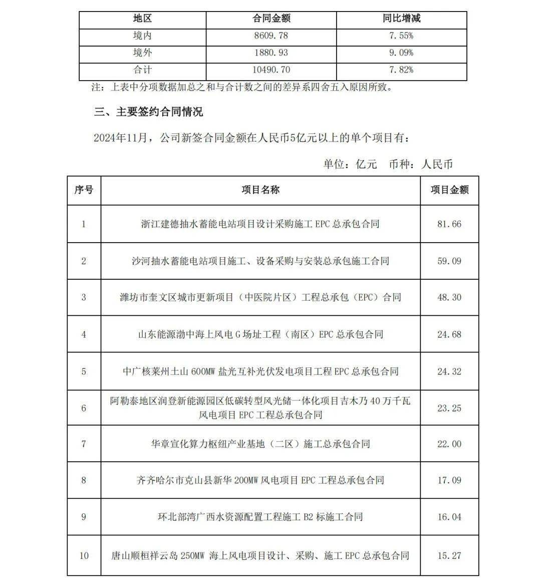 12月20日,中國電建發(fā)布《 中國電力建設(shè)股份有限公司2024年1月至11月主要經(jīng)營情況公告》,披露了2024年1-11月,2024年11月,公司新簽合同金額在人民幣5億元以上的單體項目共有40個。
