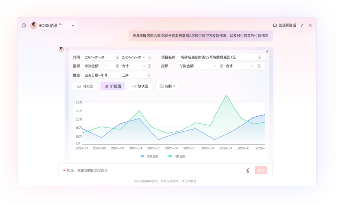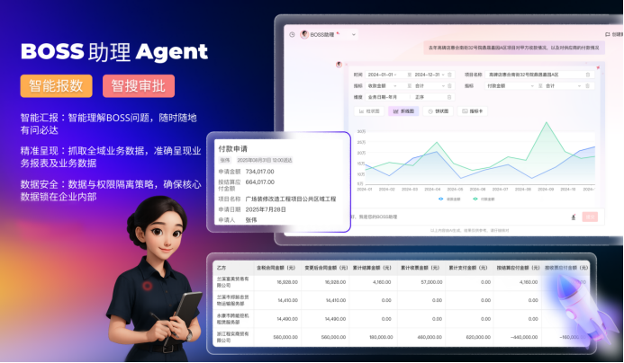 在具體應(yīng)用中,BOSS助理可快速鎖定數(shù)據(jù),例如查詢“張偉昨天提交的審批”,AI通過意圖識別下發(fā)指令,系統(tǒng)在判斷權(quán)限后返回列表,精準(zhǔn)調(diào)取對應(yīng)審批,實現(xiàn)急事優(yōu)先快速處理。此外,它還能響應(yīng)諸如“查看高碑店項目各供應(yīng)商支付情況”的復(fù)雜查詢,直接呈現(xiàn)合同金額、結(jié)算金額、支付金額等關(guān)鍵指標(biāo),幫助管理者快速發(fā)現(xiàn)異常并追溯源頭。