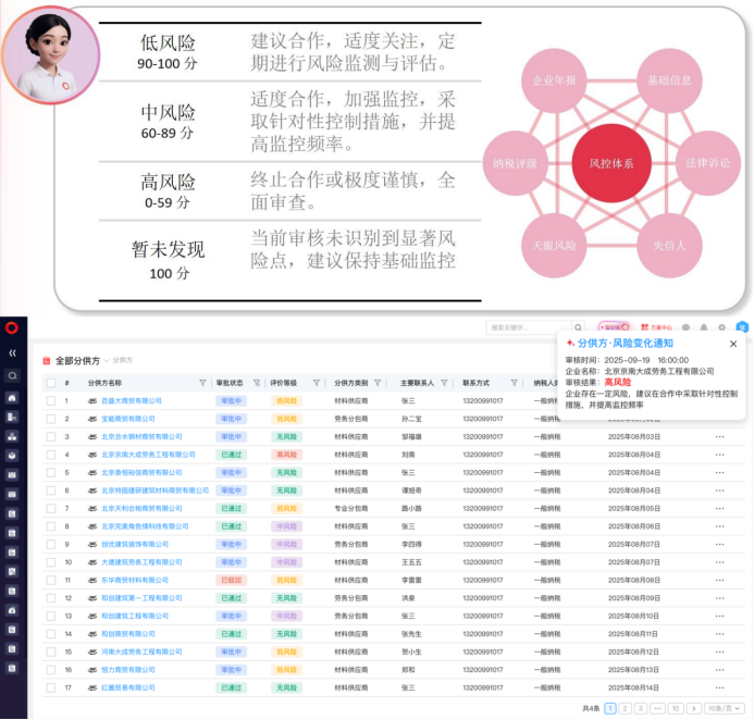 根據(jù)評分結(jié)果,供應(yīng)商被劃分為低風(fēng)險(90-100分)、中風(fēng)險(60-89分)、高風(fēng)險(0-59分)和暫未發(fā)現(xiàn)風(fēng)險(100分)四類,并分別給出“建議合作,適度關(guān)注”“適度合作,加強(qiáng)監(jiān)控”或“終止合作,全面審查”等建議。例如,在評估某供應(yīng)商時,系統(tǒng)會詳細(xì)列出其法律訴訟情況、納稅評級等,幫助企業(yè)全面判斷合作風(fēng)險。
