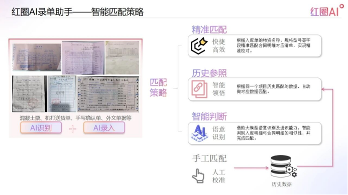 錄單助手還具備智能匹配與成本歸集能力,能智能分析入庫材料匹配的合同明細(xì)并掛接,厘清成本發(fā)生源頭,方便后期實際成本精準(zhǔn)統(tǒng)計及溯源。其匹配策略包括三重機(jī)制:精準(zhǔn)匹配(根據(jù)物資名稱、規(guī)格型號校對合同明細(xì))、歷史參照(依據(jù)同一項目歷史數(shù)據(jù)自動匹配)、智能判斷(借助大模型語意識別相似性),確保錄入既快又準(zhǔn)。