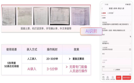 它靠大模型自動識別各類單據——混凝土票、機打送貨單、手寫確認單,連外文單據都能秒讀。關鍵字段自動提取,合同明細自動匹配,系統數據自動回填,減少90%的人工操作。入庫單進來,自動分析該掛哪個合同、哪項成本;結算單進來,自動歸集實際成本,溯源到每一筆采購。以前材料員錄單錄到眼花,現在“掃一掃”就完事。