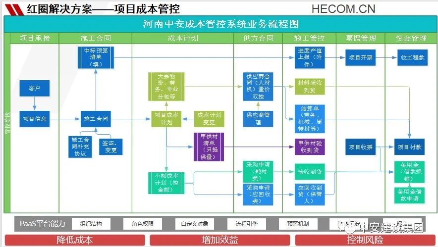 在集團公司領導班子的指導下,成本管理中心制定了詳細的工作方案,設計了60余張成本數據表格。而紅圈專業實施老師也進行了兩次系統調研,用兩周時間將60余張報表拆解合并成30余個業務管控點,并結合管控業務流程圖進行功能匹配,設計了《中安集團成本管控系統實施計劃表》,涵蓋了往來單位管理、施工合同管理、成本核算管理、成本合同管理、成本結算管理、項目資金收支管理等項目核心業務,并且細化了成本管理流程中各個系統責任人的工作職責。